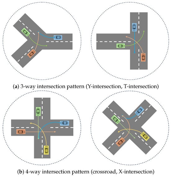 This holistic approach encompasses the development of traffic patterns on intersections that cover various configurations, each possessing unique characteristics. These patterns can include, for example, Y-intersections, T-intersections, crossroads, X-intersections, roundabouts, and more, as shown in Figure 1a. More specifically, in this work we considered two general intersection patterns: 3-way and 4-way intersections. In 3-way intersections, three roads intersect at a single point. This includes the “Y-intersection”, where two roadways join to form a single road, and the “T-intersection”, where a minor roadway meets a major roadway, as shown in Figure 1. Despite their differences in topology and geometry (road lengths), our scheme treats these cases equivalently and manages them similarly though a unified general-purpose 3-way intersection pattern. A 4-way intersection is the most common traffic type that involves the crossing of two roadways. This pattern used in our analysis covers not only cases where the roads appear perpendicular, but also various design configurations where roads can intersect at any angle. Two such examples are shown in Figure 1b.