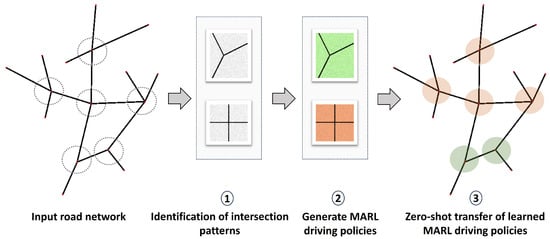 Finally, we propose a zero-shot knowledge transfer process designed to facilitate the reuse of acquired knowledge across multiple intersections within the road network. Learned MARL policies are directly applied to similar intersections, streamlining traffic management and minimizing the need for extensive adaptation. Figure 2 depicts the overall structure of the proposed method for traffic flow management in urban areas with multiple unsignalized intersections.