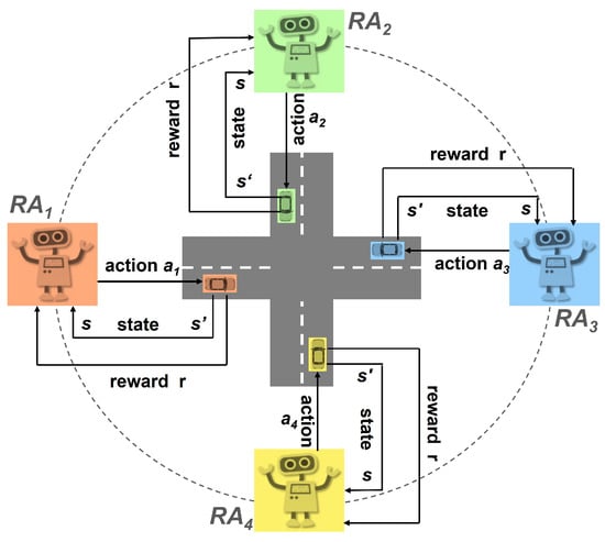 Under the MA-MDP formulation, the agent adheres to a policy within a given environment. A policy in RL is a strategy that determines the actions of an agent based on its current state. Let us consider a vehicle following its corresponding road-agent, . At each time step, this vehicle is found in a specific state, denoted as , and it chooses an action, , according to the policy, , implemented by its corresponding road-agent. Subsequently, the vehicle transitions to a new state, , and yields a reward, . Figure 3 illustrates an example of how the proposed MARL scheme is applied to a 4-way intersection pattern (crossroad) for modeling traffic control.