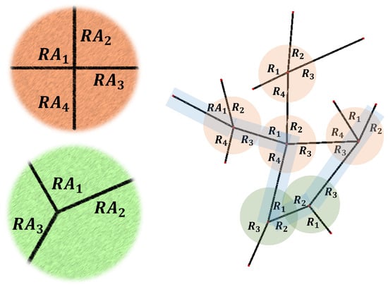 Figure 4 illustrates an example of how a road network, consisting of four “4-way intersections” and two “3-way intersections”, inherits the driving policies of two default intersection patterns. The procedure followed by each vehicle to complete a route (e.g., light-colored thin strip in the road network of Figure 4) within the road network is as follows. At the beginning of its navigation, the MARL policy associated with the first visited intersection (a 4-way pattern) is activated to guide the vehicle through smoothly and securely. Upon exiting the intersection, the vehicle transitions to the outgoing lanes and continues its journey towards its destination, passing through a sequence of five intersections. As the vehicle enters the field of view of another intersection, it comes under the control of a new multi-agent system, which governs its path through this intersection. The new policy may resemble those applied in previous interactions, with similar characteristics that the vehicle has encountered (e.g., the first two intersections of the route in Figure 4).