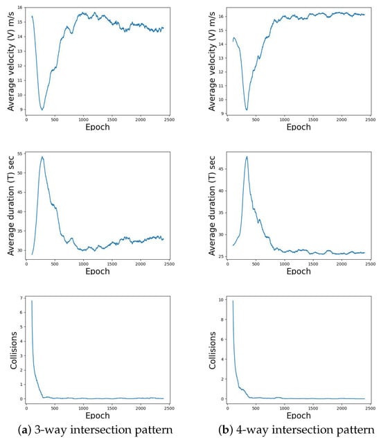 Based on the illustrated driving profiles in the learning diagrams, it is apparent that the average duration for traversing individual intersections, whether they are 3-way or 4-way, stands at roughly 16 s. Upon implementation within the experimental road networks and integration with their corresponding intersections, the observed outcomes, shown in Table 3, Table 4, Table 5 and Table 6, reveal not only a high degree of resemblance to their learned behavior, but also an ability to extrapolate and accommodate diverse traffic scenarios and instances of congestion. It can be easily observed, for example, that the average duration for passing through any intersection in the network (Table 3) ranges from around 12 (case ) to 20 s (case ), depending on the level of the vehicles’ arrival rate. This proves that the multi-agent policies are designed in such a way that they exhibit both resilience and adaptability, thereby guaranteeing an optimal level of control on traffic management across a spectrum of scenarios and varying intersection layouts within road networks. The proposed knowledge transfer process enhances the scalability and the consistency of these policies.