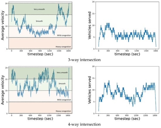 The same observations can be obtained by adopting the speed performance index (SPI) used to evaluate urban road traffic conditions [57]. This measure quantifies the congestion level (ranging from 0 to 100) and can be defined by the ratio between vehicles’ velocity (v) and the maximum permissible velocity (), . According to this index, the traffic state level can be classified into four zones with three threshold values (25, 50, and 75): heavy (), mild (), smooth (), and very smooth () congestion levels. Since in our study we have considered m/s, then the congestion zones are divided into value intervals of length 5. The depicted velocity diagrams in Figure 6 show this division into (colored) zones in both intersections. In summary, the congestion level never reached a heavy degree throughout the execution of the scenarios. The most common traffic state in the 4-way intersection was the smooth, while halfway through the scenario of the 3-way intersection the status was found to be mild congestion, due to its structure and its inability to offer a balanced distribution of traffic.