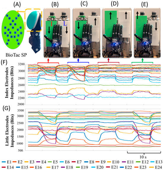 (A) The BioTac SP has 24 sensing electrodes. (B) Photo sequence showing the Shadow Hand in contact with the sliding surfaces. Both the sliding surfaces are slipping down. (C) The index (I) finger surface is slipping down while the little (L) finger surface is slipping up. (D) Both sliding surfaces are slipping up. (E) The I finger surface is slipping up while the L finger surface is slipping down. (F) BioTac SP electrode impedances of the I and (G) L fingers changed characteristically during the different slipping scenarios.
