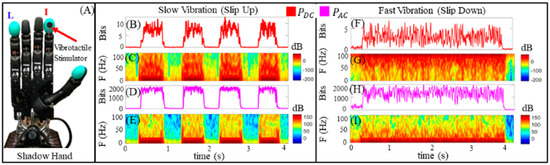 The time–frequency spectrogram representation for the data was calculated using a 512-point FFT with 0.08 s frame length and a Hanning window with 90% overlap. The time–frequency power distribution data show the frequency components of PDC and PAC for the Slow (slip up; Figure 4C,E) and Fast (slip down; Figure 4G,I) vibrotactile actuation modes. Note that the powers of these signals are broadly distributed through 100 Hz, which falls well within published accounts of human perceptual ranges [38,45,46]. These produced very different activation signatures, which enabled people to clearly distinguish between the different sensations corresponding to upward and downward sliding contact, which will be described more in Section 2.6.3.