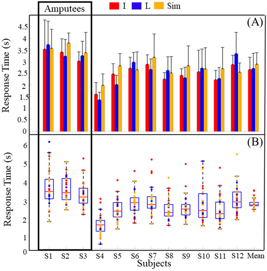 (A) Each subject’s response time for the I, L, and Sim classes. (B) Box plots for every subject’s response times with each class. The amputees had a significantly longer time to respond to the haptic stimuli than the non-amputees.