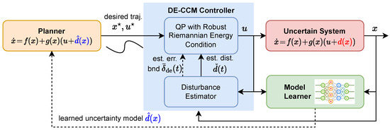 From Section 2.4 and Section 3.3, we see that the disturbance estimate provided by Equations (15) and (16) and incorporated in the RRE condition Equation (35) is the discrepancy between the true dynamics and the nominal dynamics without the learned model (i.e., ). Alternatively, we can easily adapt the estimation law Equations (15) and (16) to estimate (i.e., the discrepancy between learned dynamics Equation (4) and true dynamics) and adjust the RRE condition accordingly. However, as characterized in Equation (19), the EEB depends on the local Lipschitz bound of the uncertainty to be estimated, which indicates that a Lipschitz bound for is needed to establish the EEB for it.
