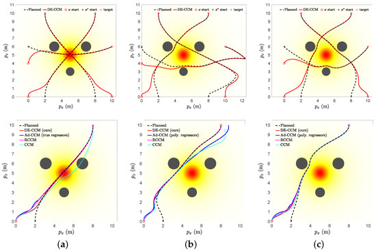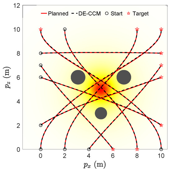 Figure 2 (top) illustrates the planned and actual trajectories under the proposed controller utilizing the RRE condition and disturbance estimation (referred to as DE-CCM), in the presence of no, moderate, and good learned model for uncertain dynamics. For these results, we did not low-pass filter the estimated uncertainty, which is equivalent to setting in Equation (24). Spectral-normalized DNNs [28] (Remark 4) with four inputs, two outputs, and four hidden layers were used for model learning. For training data collection, we planned and executed nine trajectories with different start and end points, as shown in Figure 3. The data collected during the execution of these trajectories were used to train the moderate model. However, these nine trajectories were still not enough to fully explore the state space. Sufficient exploration of the state space is necessary to learn a good uncertainty model. Thanks to the performance guarantee, the DE-CCM controller facilitates safe exploration, as demonstrated in Figure 3. For illustration purposes, we directly used the true uncertainty model to generate the data and used the generated data for training, which yielded the good model.
