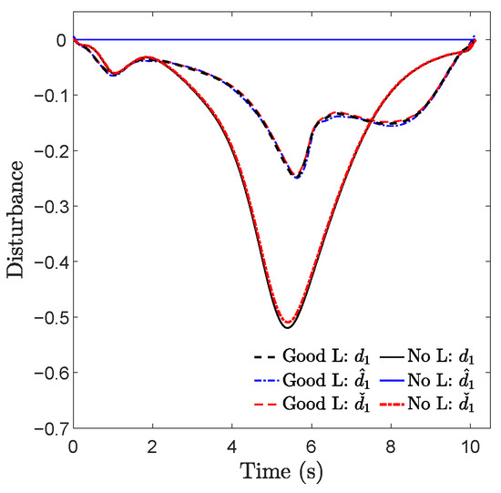 Trajectories of true, learned, and estimated disturbances in the presence of no and good learning for Task 1. The notations , , and denote the first element of d, , and , respectively.