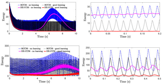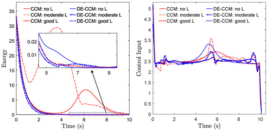 The role of the low-pass filter in protecting system robustness under the no learning case is illustrated in Appendix A. We next tested the robustness of RCCM and DE-CCM against input delays under different learning scenarios. Note that, unlike linear systems for which gain and phase margins are commonly used as robustness criteria, we often evaluate the robustness of nonlinear systems in terms of their tolerance for input delays. Under an input delay of , plant dynamics Equation (1) becomes . For these experiments, we leveraged a low-pass filter to filter the estimated disturbance following Equation (24). In principle, the EEB of 0.1 used in the previous experiments would not hold anymore, as the presence of the filter would lead to a larger error bound according to Equation (27). However, we kept using the same EEB of 0.1, as the theoretical bound according to Equation (27) could be quite conservative. The Riemann energy, which indicates the tracking performance for all states, is shown in Figure 7. One can see that, under both delay cases, DE-CCM achieves smaller and less oscillatory Riemann energy, indicating better robustness and tracking performance, compared to RCCM.