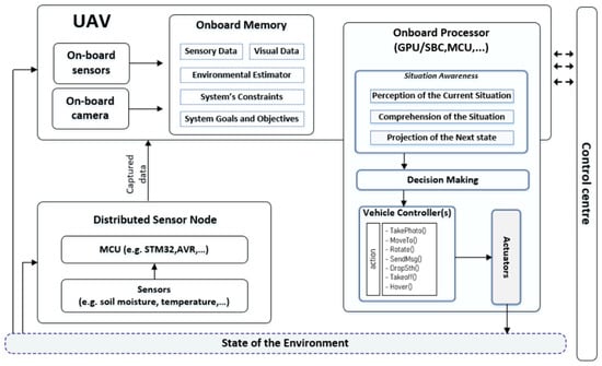 SA facilitates automatic identification and reasoning on obtained knowledge in a complex and dynamic environment to understand the current state of the environment to anticipate the future state. It is important for an autonomous vehicle, such as a UAV, to operate successfully in dealing with continuously changing situations. SA keeps the vehicle focused on only relevant and meaningful information [1]. UAVs can operate as mobile agents to enable continuous SA of a vast area, penetrate constricted spaces out of reach of humans, and therefore save considerable vital time and effort. Consistently analyzing the information and data captured by distributed sensors throughout operations, including those onboard UAVs, significantly enhances comprehension of the broader situation. However, the substantial volume of generated data requires extensive processes for transfer, handling, and storage. Meanwhile, UAVs must contend with environmental challenges amid limitations like energy scarcity and unpredictable surroundings [2,3].
