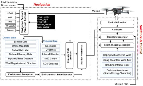 In any general operation scenario, the vehicle and environment experience continuous changes during the mission, and events perceived by the vehicle continuously change its perception of the environment. The critical challenges posed by the environment, such as adverse wind, harsh weather conditions, and the presence of static/dynamic/uncertain collision barriers, significantly impact the UAV’s maneuverability, battery consumption, connectivity, and overall operation performance. Due to their small size and lightweight, multirotor UAVs are susceptible to sudden weather changes. As a result, it is crucial to adapt to dynamic weather conditions in real-time to ensure safe and efficient UAV operations. The urgency of establishing rapid and precise responses to sudden weather changes remains a paramount challenge to be addressed.