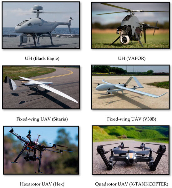 - Unmanned Helicopters (UH): A typical UH has a top-mounted motor with a large propeller for lift and a tail motor to balance torque. UHs are agile and suitable for complex environments but have high maintenance costs due to their complex structure. They are ideal for surveillance and tracking missions (e.g., traffic monitoring, border surveillance) due to their hovering capability and maneuverability [38,39].