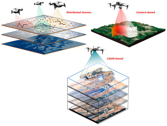 The focus of this section lies in a comprehensive review and critical analysis of existing UAV methodologies concerning both SA and EA in multifaceted contexts [56,57]. These methodologies primarily center on information monitoring and processing for prediction and early detection. In this review, UAV applications for SA are classified into three main categories based on distinct data fusion approaches. Each classification undergoes an in-depth examination of relevant research activities, depicting their methodologies and advancements. Moreover, this review critically addresses persistent research and development challenges that pose ongoing obstacles in the field. Figure 6 represents the conceptual example of capturing SA using distributed sensors, on-board camera, and LiDAR.