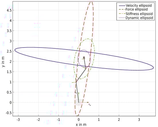 which will not further be considered. The velocity manipulability measure in Equation (13) is proportional to the volume of the velocity ellipsoid [26,32], whose semi-axes correspond to the square roots of the eigenvalues of and point in the direction of the eigenvectors of . Near a singular configuration, the velocity ellipsoid is increasingly compressed. In the singularity, it collapses; thereby, the distance to a singularity can also be evaluated. For the two-dimensional example in Figure 1, it becomes a line. The velocity ellipsoid shown gives a quantitative measure of the ability of the EE to move in any direction. Larger values of represent greater freedom for the movement of the EE in a specific configuration [7].