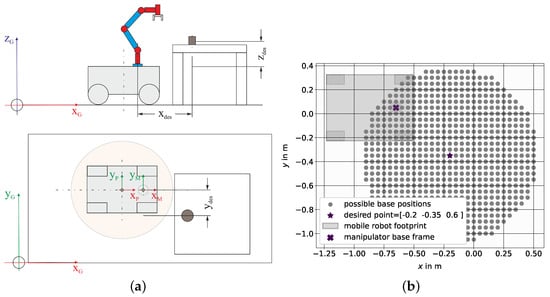 of feasible base positions can be found. Assuming a planar movement in the -plane of the mobile base, and due to Equation (41), is set to zero, and it will further be neglected. Each element in the new set represents a suitable position of the mobile base to ensure the desired EE position, , using different manipulator-joint configurations. By evaluation of the continuous set with discrete values for and with