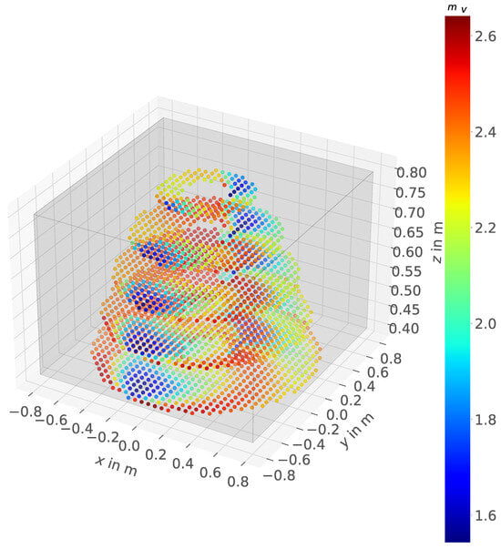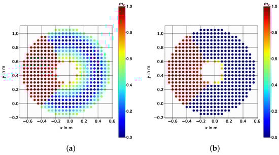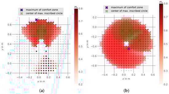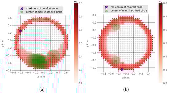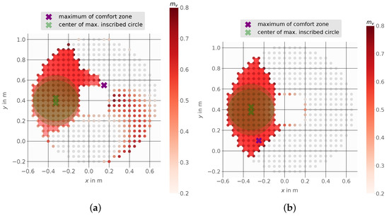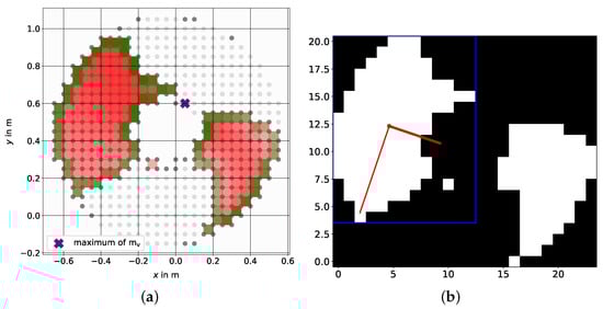 with points can be found. Figure 2b shows an exemplary set of feasible positions for a mobile base with a mounted serial manipulator. The discrete set of points is used to find a subset, defined as a task-dependent comfort zone (see Equation (54)) for mobile manipulator placement. Thereby, different manipulability measures, , as described in the previous sections, are used to evaluate the corresponding joint configuration for each point in the discrete set.