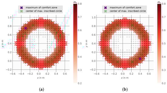 Comfort zone for the mobile manipulator Kairos using the angular velocity -dependent manipulability measure with a minimum of 30% manipulability for the EE pose (a) () and EE position (b) ().