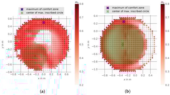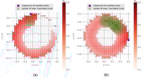The mobile manipulator Kairos from the company Robotnik (Valencia, Spain) (https://robotnik.eu/, accessed on 3 August 2024), combines a mobile base using Mecanum wheels with a mounted Universal Robot UR5 serial manipulator, as shown in Figure 13. Figure 13a shows the kinematic chain of Kairos, which achieves in total of nine DOF, including the mobile platform joints , , and and the manipulator joints to . The Universal Robot UR5 manipulator is often used in medium-sized companies, as well as in research and development. Its parameters, including link inertias, can be found in [65,66]. Figure 14 shows the results using based on linear velocities. Figure 14a shows that a mobile base placement at the proposed point (the center of the maximal possible inscribed circle) offers the advantage of staying within a zone of minimum 30% manipulability, even when the platform is moved. The maximum value of the manipulability is located outside the comfort zone. Hence, using this position, already, a small movement of the mobile platform would lead to a manipulability lower than 30% of the maximal value, and the same is also valid for Figure 14b.