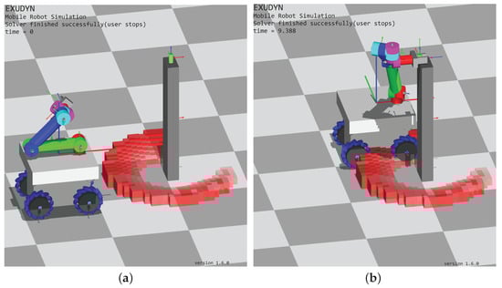 Figure 15 shows the results using based on angular velocities. The mobile base placement at the proposed point (the center of the maximal possible inscribed circle) achieves a large zone of minimum 30% manipulability. In Figure 15b, the maximum value of manipulability is located near the middle of the comfort zone. Here, a small area is excluded from the comfort zone, so a base movement into this area could lead to a failure of the task—as the inverse kinematics could not find a solution for this example. The center points of all inscribed circles would be feasible mobile-platform goal positions with higher flexibility in base movement and ensure a solution for the inverse kinematics. A selection between them could be made via a comparison of the individual manipulability of each point, but for all points here, the manipulability is at least higher than or equal to 30% of the maximum value. Figure 16 shows the mobile manipulator Kairos within a Python simulation. There, Exudyn (a C++ based Python framework for flexible, multibody systems’ simulation) was used to simulate the mobile platform, as well as the manipulator. The mobile platform and the manipulator links are represented as rigid bodies, and the Mecanum wheels are modeled with a contact-friction model based on the rolling disk, as described in [4]. In Figure 16a, the task starts, and the comfort zone (possible mobile-base goal placements) is drawn using red boxes. The height of each box corresponds to the manipulability measure used, . Figure 16b shows the mobile manipulator within the pick task when the mobile base is already in its goal position.