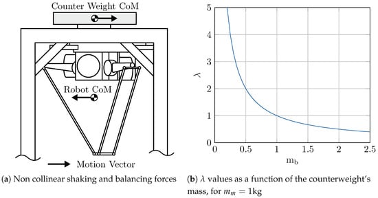 - Parasitic shaking forces and moments: If the shaking forces are not collinear with the balancing forces, force balancing will result in additional parasitic shaking moments. This is shown schematically in Figure 3a. The motion of the counterweight’s and the robot’s CoM are parallel but not colinear. Even if the sum of the inertia forces is zero, they create a force couple around the attachment point, which leads to a parasitic shaking moment.