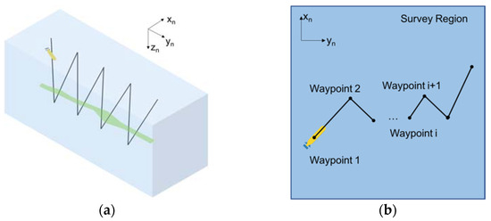 AUVs’ performance in plume tracing tasks greatly depends on their survey strategy. The most common strategy undertaken by AUVs in practice is to follow a preplanned lawnmower pattern [6,10]. This canonical survey path is usually adopted to achieve full coverage over a studied region. However, significant features of the subsurface plume may be missed because the location and extent of the plume are usually priorly unknown. Efforts have been made to optimize the survey strategies with which AUVs can plan the sampling path to the plume source.