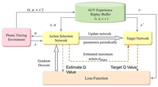 DDQN algorithm for AUV path planning for plume tracing, where s and s′ denote the current and the next states, respectively, a denotes the action taken, amax denotes the action corresponding to the maximal Q-value output from the action selection network, r denotes the immediate reward received after the action is executed, and {s,a,r,s′} denotes the experiences saved in the AUV experience replay buffer.
