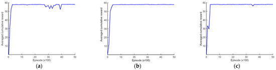 Asymptotic performance of the DDQN algorithm in the averaged cumulative reward: (a) survey strategy with 30 initial random sampling episodes; (b) survey strategy with 30 initial uniform sampling episodes; (c) survey strategy without initial sampling.
