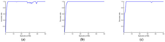 Asymptotic performance of the DDQN algorithm in the success rate: (a) survey strategy with 30 initial random sampling episodes; (b) survey strategy with 30 initial uniform sampling episodes; (c) survey strategy without initial sampling.