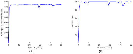 Asymptotic performance of the DDQN algorithm in transient plume tracing: (a) averaged cumulative reward, indicating the average over every one hundred episodes; (b) success rate, indicating the rate of successfully arriving at the plume source over every one hundred episodes.