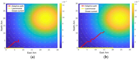 This section presents a comparison between the proposed adaptive approach and the lawnmower approach. In both cases of the steady and transit plumes, survey paths generated by the adaptive approach and the lawnmower approach are presented in Figure 7 and Figure 9, respectively. These results indicate that the adaptive path planning approach eventually provides a feasible solution to the plume source tracing problem, but it may take much time to learn from the interactions with the environment. As indicated in the results presented in Section 4.3 and Section 4.4, about 50 episodes are required to detect the source of the steady plume represented by the Ackley function, and 20 episodes are needed for the Gaussian transit plume. In the case of the lawnmower survey pattern, we suppose a survey range of 60 km and a 1 km distance between the track lines for each operation, corresponding to 60 time steps in the numerical simulation. The individual operation time can then be obtained by a simple calculation as 33 h and 20 min. A total of 15 successive operations would be required to achieve full coverage over the survey region. When only one AUV is utilized, the total survey time is an accumulation of the duration of every individual operation. The comparison on the total survey time required by the adaptive approach and the lawnmower approach is presented in Figure 10. It is apparent that the lawnmower survey pattern would be a better strategy when only one AUV is available, especially when the plume structure is complex.