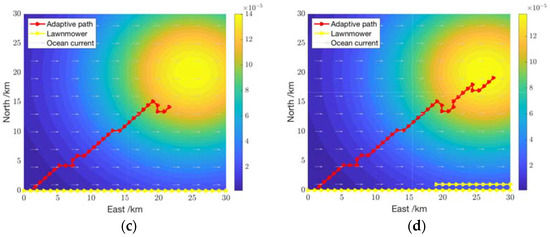 Transient plume tracing using adaptive path planning and lawnmower survey pattern: (a) Stage 1: 10 time steps (~5.5 h); (b) Stage 2: 20 time steps (~11 h); (c) Stage 3: 30 time steps (~16.5 h); (d) Stage 4: 42 time steps (~23 h).