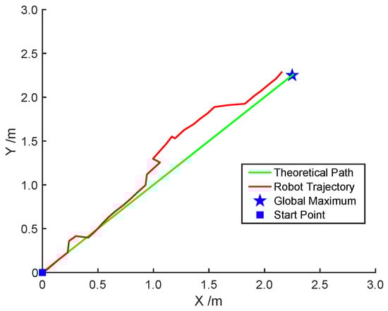 In the experiment, the robot moved with a step size of 100 mm, and the maximum number of steps was set as 60. The global extreme locating task is believed to be successfully completed if within 60 steps, the robot arrives at a location that is less than 100 mm from the destination; otherwise, it fails. Figure 12 shows the autonomous navigation process using the proposed adaptive path planning approach, and Table 5 lists the experimental results. It took the robot 36 steps to arrive to the proximity of the global extreme. The actual robot trajectory and the theoretical optimal path are demonstrated in Figure 13. The experimental outcomes showed that the robot could autonomously move to the proximity of the global maximum using the proposed adaptive path planning approach. The distance between the robot’s final location and the goal is around 94 mm. The deviation between the robot’s trajectory and the theoretical path may be a result of actuation error and sensor uncertainty.