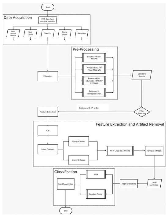 Figure 2 depicts the flowchart starting from the data acquisition to the machine learning application. As observed, the flowchart also includes: (i) pre-processing and (ii) feature extraction and artifact removal. All the analyses were conducted in Matlab (R2022a, The MathWorks Inc., Natick, MA, USA) using the EEGLAB toolbox (version 14.1.0) [24].