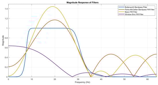 The first step of the data analysis involved the removal of certain frequencies. Although different types of filters were initially considered, the Butterworth band-pass filter was consistently selected for all subsequent analyses due to its superior performance, as illustrated in Figure 3. Specifically, a 6th-order Butterworth band-pass filter, which is known for its smooth frequency response and lack of ripples, was applied to isolate and analyze alpha (8–13 Hz) and beta (13–30 Hz) waves. This filtering enhances the signal-to-noise ratio, making it particularly suitable for detecting brain activity patterns relevant to locomotion, according to the literature [12]. In addition, it has been demonstrated that the filtering allows enhancing of the signal-to-noise ratio, permitting a more reliable and robust detection of brain activity patterns, a fundamental aspect for the application of machine learning algorithms [19].
