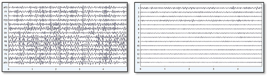 EEG signals (Left) and independent components (Right) (x-axis represents the time in seconds, while the y-axis represents the micro voltage measured by each electrode and ICs).