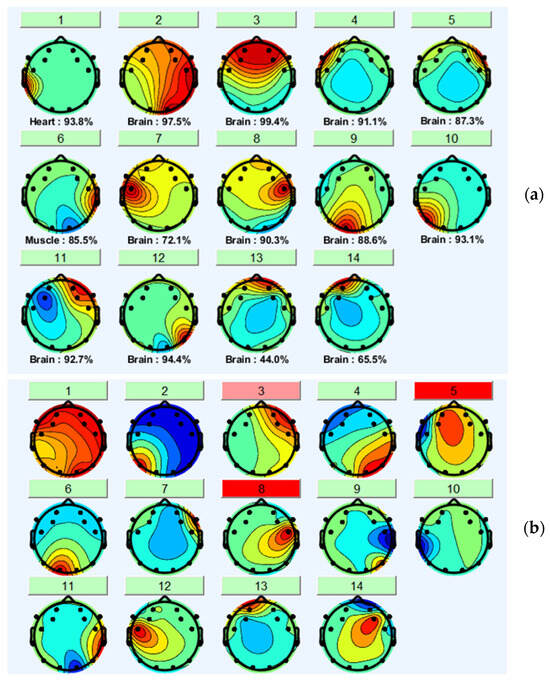 where X is the matrix acquired through the EEG system, W represents the unmixing matrix, and S the sources, also called independent components—ICs. Thus, the 14-channel signals were decomposed into 14 ICs, ordering them in accordance to decreasing variances [28].