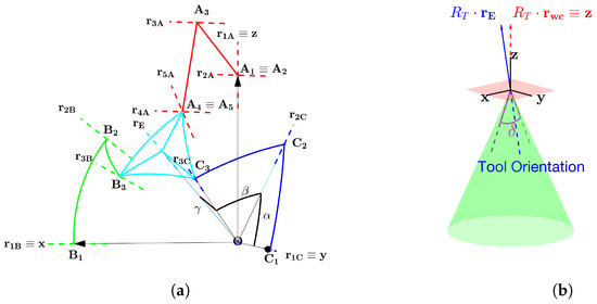 As stated in Section 1, the qSPM device consists of two spherical RRR legs (leg B and C), and a URU leg (leg A, as in Figure 1b). Kinematic models are delineated and formalized in [23,24,25]. Reporting a nomenclature scheme in Figure 2a for clarity, the following main premises can be outlined ():