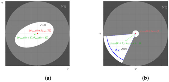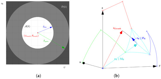 (a) Restricted neighborhood Equation (9b), colored according to Equation (11): white, grey, and black areas correspond, respectively, to force-related admitted area Equations (11a)–(11c). Red points correspond to the point . (b) Geometrical explanation of vector Equation (12). The vector is not to scale, and was increased for readability.