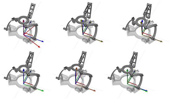 IKM and FKM are the functions linking the platform’s orientation to the actuated triplet , respectively, and vice versa. As the IKM function leads to eight different solutions, i.e., working modes , depending on the posture of the legs and on the sign of the elements of the diagonal matrix [30], each FKM can be computed according to the constraints topologically imposed by each working mode. It has been demonstrated that the FKM can be computed with great computational gains by adding an additional encoder sensor on link and thus measuring [24].