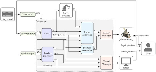 - Slave plant: Interacting with the architecture by inputting for RCM position control, and outputting , as in Equation (5);