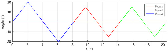 For the experiment, the selected teacher trajectory , stored in a suitable , is reported in Figure 8, and consists of a simple trajectory in which and linearly span and , respectively.