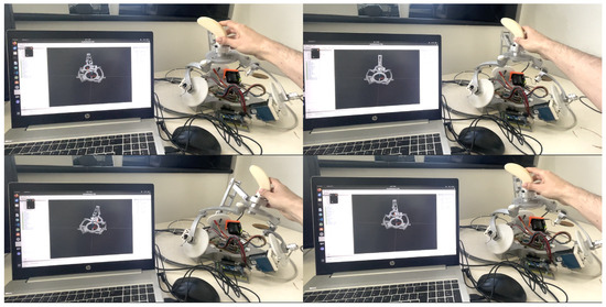 The visual environment can be enhanced by adding extra information regarding the pose of the object, for instance, reporting, for the assistive control mode, RFs associated with and according to Equation (7) and Section 2.4.3, and as in Figure 6. In order to enhance the visual feedback, the RF related to , reporting the actual pose of the platform, can be colored in an automatically-updating red/green hue, describing a near (green) or distant (red) from in a way consistent with Equations (11) and (13). In this way, the end user is constantly aware, by looking at the screen, of where the current position of is and how to correct the platform’s pose in order to reach .