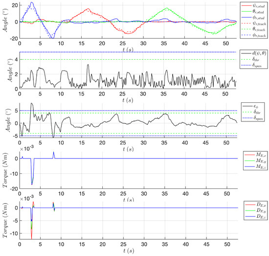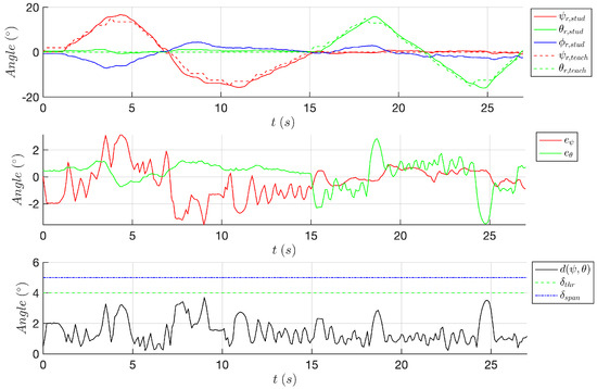 in which we assume, for clarity, notation ; is the sampling index; is the sampling period; is the student trajectory, i.e., the one which is the current output of the FKM function; is the teacher trajectory, i.e., the one which the student aims to follow, predetermined in a stored matrix ; is the k-th line of , storing ; is the rotational matrix related to the Euler angle, as in Equation (1). Details of relevant parameters can be found in Table A1.