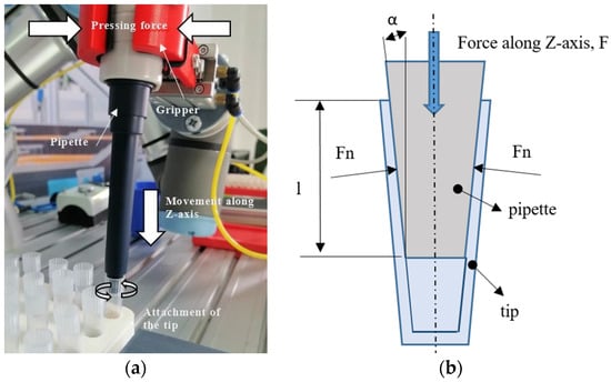 Process of attaching the tip to the pipette: (a) inserting process and (b) theoretical model for a conical shrink-fit assembly [36].