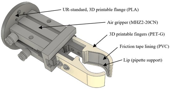 For this device, a tool flange adapter conforming to ISO 9409-1-50-4-M6 [43] was designed and 3D printed to affix it to the robot. Also, a set of fingers/clamps was designed and 3D printed for the pipette. The assembly model is presented in Figure 6.