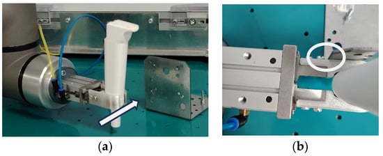 Testing the lateral hard collision of the gripper. (a) Collision trajectory (arrow) and (b) contact/hit point with the metal plate (encircled).