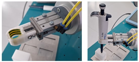 The main advantage of the proposed solution is as follows: the use of readily available mainstream industrial components that allow for quick and cost-effective system replication for laboratories that need some type of pipetting process automation. Another notable point is that several manual pipettes can be used during the process, which are gripped and manipulated in sequence; each of them is set to a specific dispensing volume. Although not detailed in this study, it must be noted that the reagents and sample volumes to be dispensed during PCR analyses are different for each (reagent/sample) type. Another advantage is the easy setup process of the robot’s end effector and the safe pneumatic actuation nature; thus, lab personnel can easily adapt to working with the assembly.