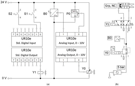 The pneumatic schematic in Figure 9b presents the pressure that was supplied by a compressed air source (a mobile compressor) and that was passed through an air service unit, where it was filtered and limited to five bar. The compressed air then entered the electrically controlled proportional pressure regulator Y0. The regular has an internal pressure feedback sensor that also delivers an analog signal, and it is presented as B0. The pressure-controlled air then enters a directional control solenoid valve Y1, which is used for directing the flow to open or close gripper Grp.