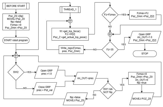 A flowchart of the robot program is presented in Figure 10 for the sake of simplifying explanations regarding concurrent robot actions and also for easier program reproducibility. Force measurements and stop decisions are carried out in a separate thread; thus, user input, output control, and motion tasks run in parallel with force measurement and data-sending tasks.