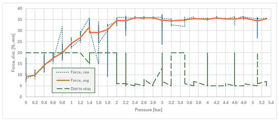 Following the experimental workflow, a pressure step interval of 0.2 bar was selected and used, and the test routine was launched using switch S1. For every pressure setpoint, n = 10 samples were measured, and the average force FZ was considered. The results are presented in Figure 11; combining the raw recorded force, the robot’s average force and traveled distance were measured until it stopped. Abnormal values were kept for reference. Supporting raw data for both experiments is available in Supplementary Materials [SM]. One can observe that pressures higher than 2.2 bar resulted in stoppage due to the force limit (FZ ≥ 35 N), with an average stopping distance of 5 mm. This distance is the combined result of system compliance with respect to robot stopping time.
